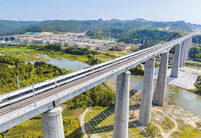 5月21日,巴南高铁进入运行试验阶段。图为试验动车组经过巴南高铁巴中市恩阳河特大桥。 付海旭 摄(C视觉)