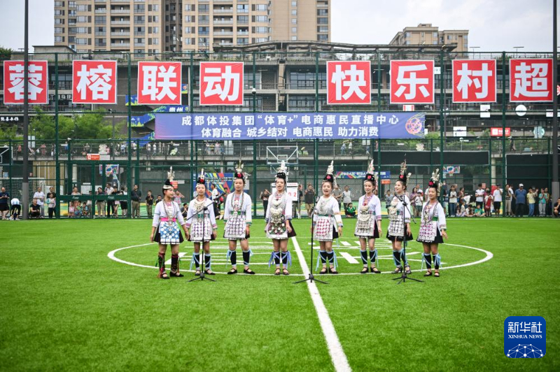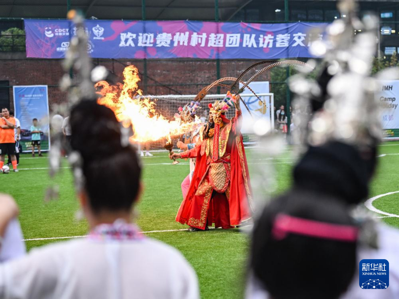 7月10日晚,来成都交流的贵州榕江“村超”文旅队与成都体投队足球交流赛在成都西村大院举行。绿茵场上运动员激烈角逐,来自两地的演员也带来了特色民俗文化表演,让观众在快乐、轻松的氛围中感受足球运动的魅力。