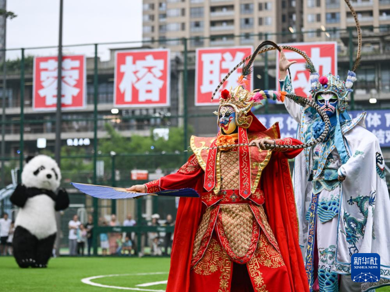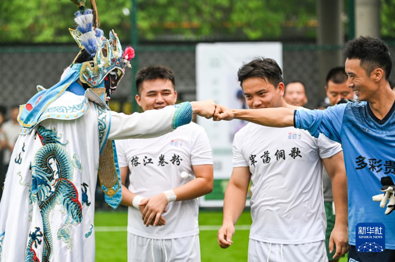 7月10日,川剧演员(左一)在比赛间隙和贵州榕江“村超”文旅队球员互动。新华社记者 王曦 摄