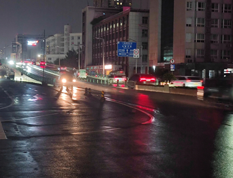 晚上8点45分,大雨过后的红星路二段交通恢复正常。路上的积水渐渐退去,跨线桥上,汽车都保持着安全距离有序通行。