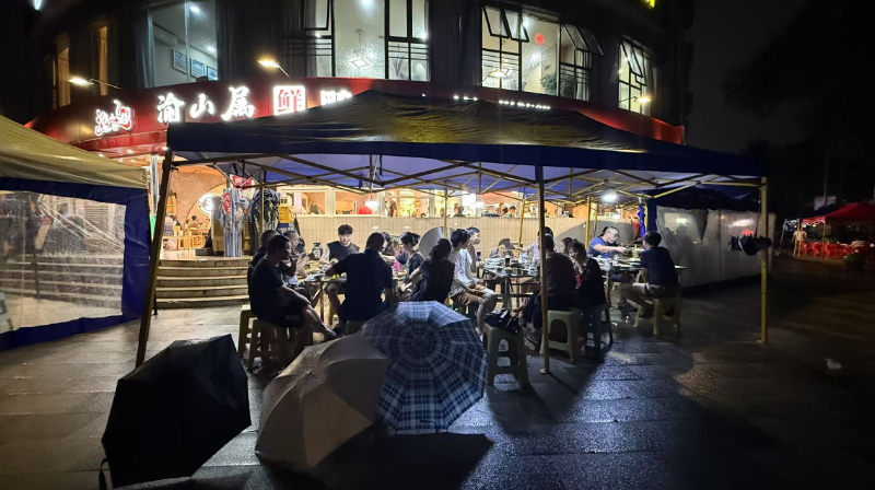 晚上8半点,锦江区晨辉路附近雨势减弱,记者在晨辉东路看到,街面已经恢复正常秩序,不少市民纷纷来到街头散步休闲遛狗,街边的餐馆也纷纷开张,来往客人络绎不绝。