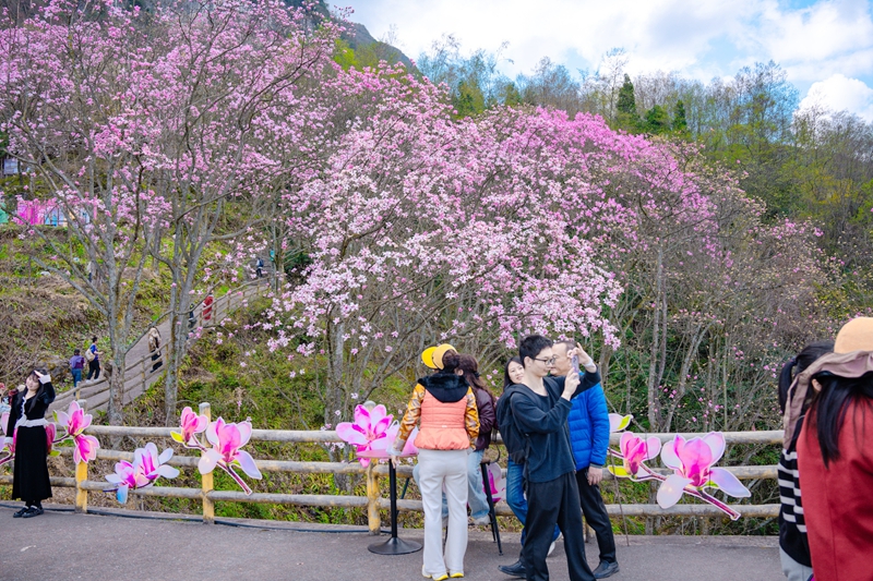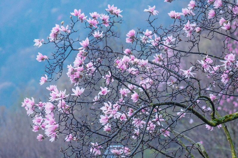 在桂溪镇九皇山、药王谷景区,漫山遍野的辛夷花正在绽放,缀满枝头。“再过几天花苞全开,肯定更壮观!”绵阳游客李女士说。