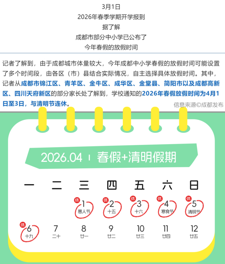 近日,成都部分中小学春假时间已出,拟与清明节假期连休,放假6天!