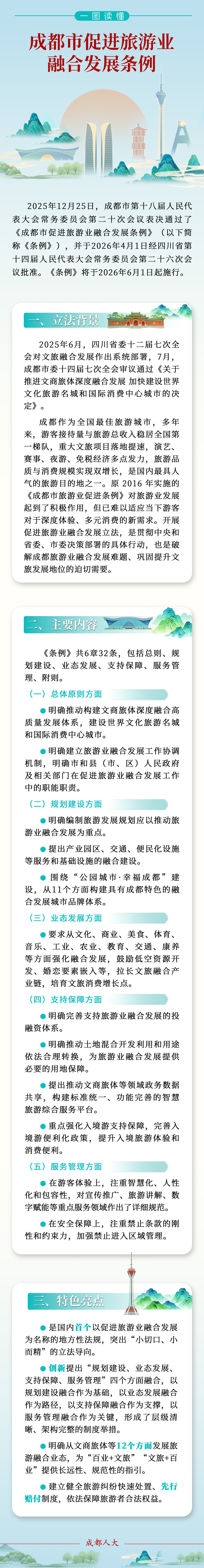 4月1日,四川省第十四届人民代表大会常务委员会第二十六次会议批准《成都市促进旅游业融合发展条例》(以下简称《条例》),《条例》将于2026年6月1日生效施行。一图读懂《条例》核心内容。
