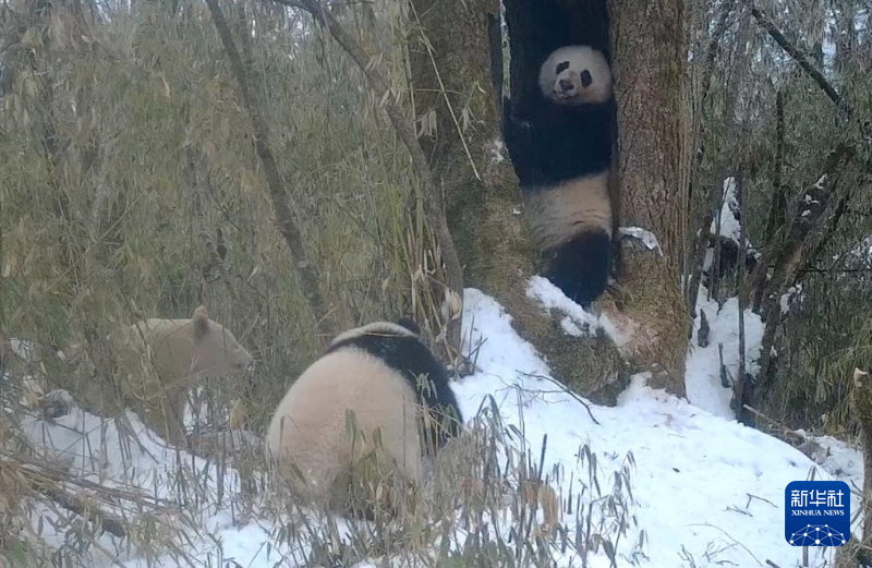 这是2月份,红外相机拍摄到的白色大熊猫(左一)与一对大熊猫母子同框的画面,熊猫幼崽(中)发现白色大熊猫后向其扑过去。新华社发(四川卧龙国家级自然保护区管理局供图)
