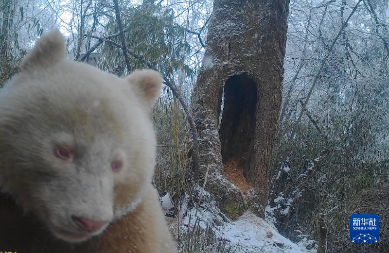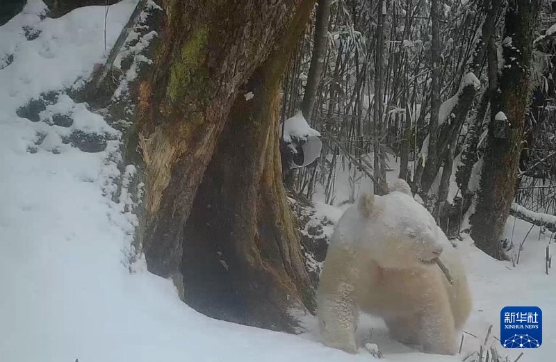 这是2月份,红外相机拍摄到的白色大熊猫活动画面,大熊猫母子离开树洞后,白色大熊猫回到树洞嗅闻熊猫妈妈曾待过的每一处地方。新华社发(四川卧龙国家级自然保护区管理局供图)