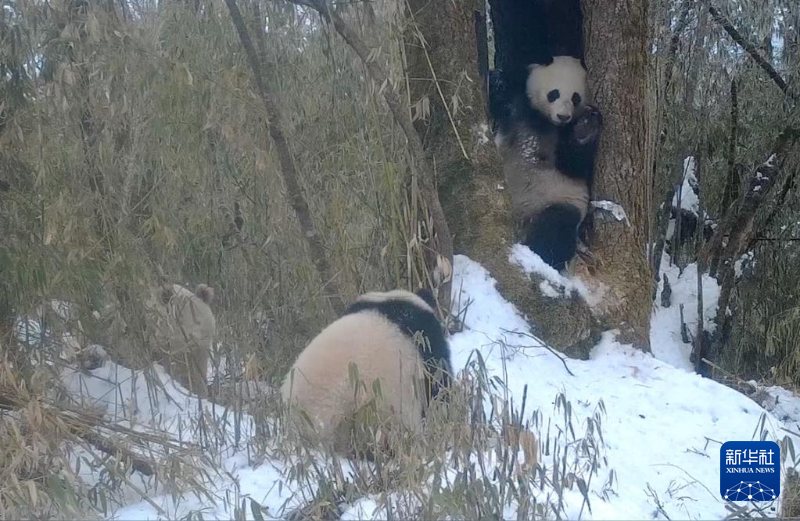 这是2月份,红外相机拍摄到的白色大熊猫(左一)与一对大熊猫母子同框的画面。新华社发(四川卧龙国家级自然保护区管理局供图)