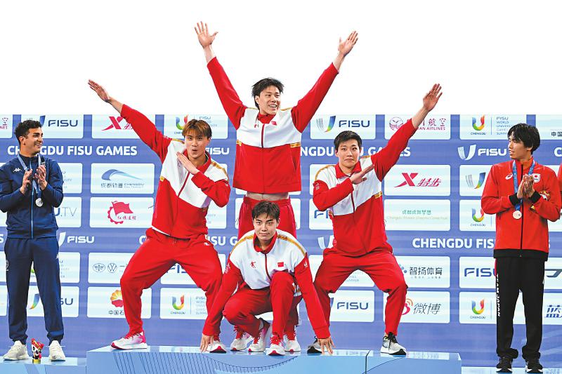在东安湖体育公园游泳跳水馆,游泳项目也迎来了最后一个比赛日。奥运冠军张雨霏接连拿到女子50米自由泳、女子4×100米混合泳接力2枚金牌,在本届大运会上获得的金牌数达到9枚。此外,张雨霏还多次打破赛会纪录。另一名奥运冠军李冰洁不仅摘得女子400米自由泳金牌,还与张雨霏等人搭档夺得女子4×100米混合泳接力金牌。这让她在本届大运会上获得的金牌总数达到8枚。男子4×100米混合泳接力金牌也被中国队收入囊中。