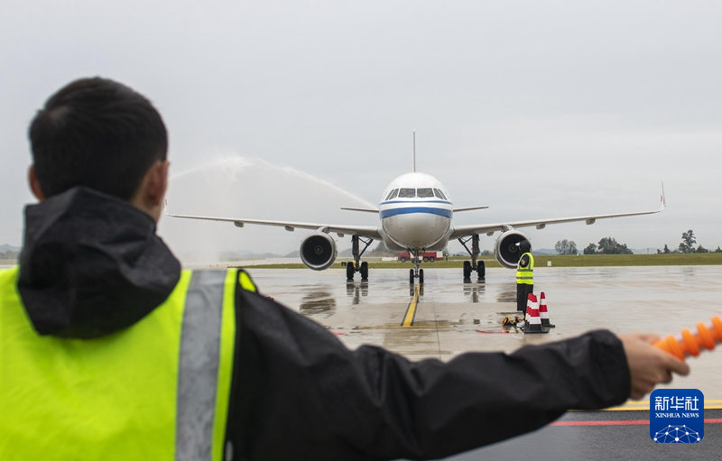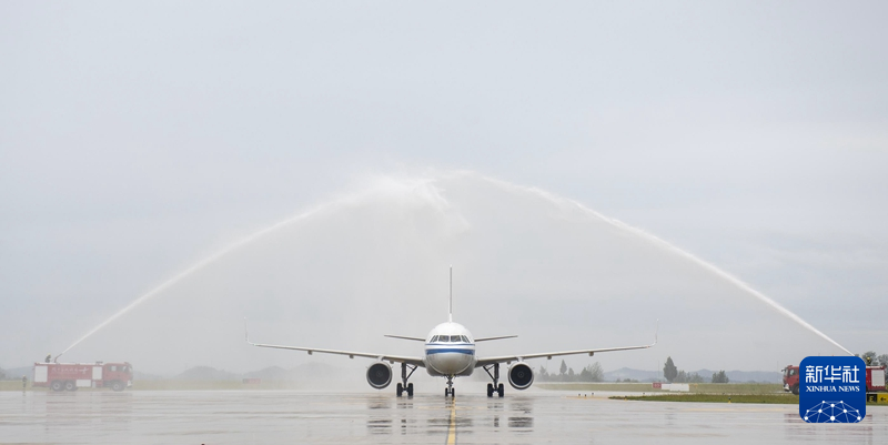 9月12日,在四川省阆中市阆中古城机场,国航空客A319飞机通过“水门”。新华社发(王玉贵 摄)