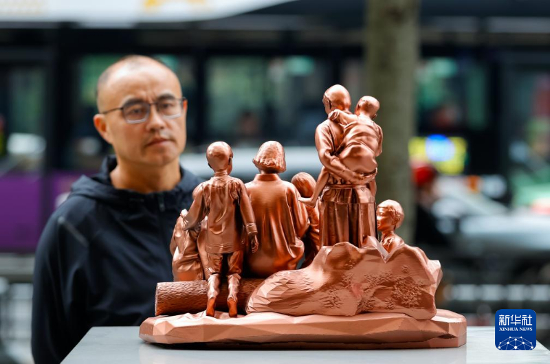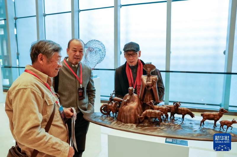 11月30日,雕塑家们在讨论首届天府雕塑展上展出的作品。新华社记者 沈伯韩 摄