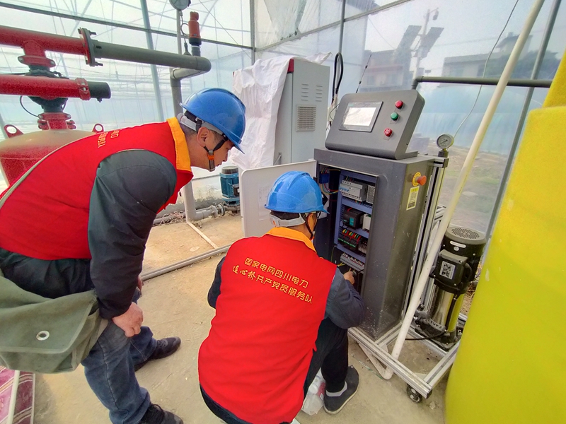 2月19日,位于四川省乐山市五通桥区的稻姜现代农业园区内,道路宽敞平坦,一排排连体塑料蔬菜大棚排列成行,村民们正忙着种下今春早姜。不远处,国家电网(四川乐山)连心桥共产党员服务队队员赵小东、王强正在对园区生姜种植大棚、智能水肥一体化集中供应中心等开展安全用电巡查。