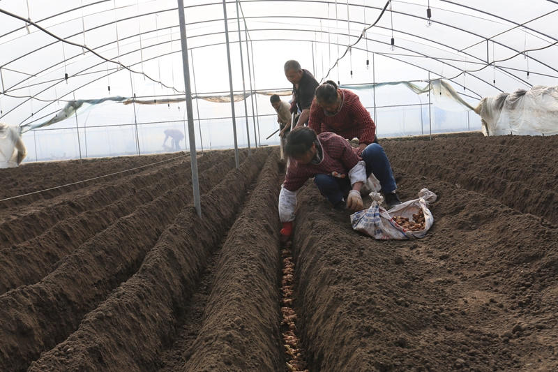在冠英镇许村生姜种植户许向东种植大棚里,村民们正挖沟、下种、施肥。赵小东、王强检查了大棚里自动喷淋设备和温湿智能监控系统,提醒姜农注意安全用电操作事项。