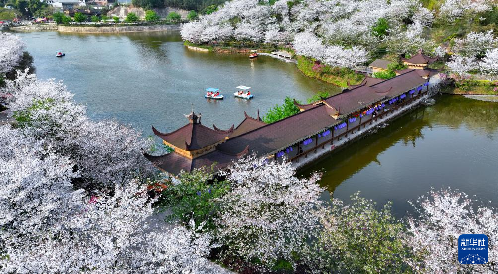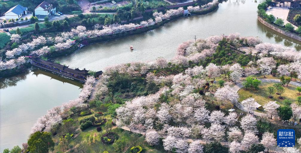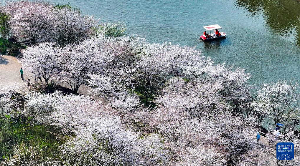 3月24日,游人在泸州市江阳区丹林镇建设村“樱花谷”泛舟赏樱(无人机照片)。新华社发(刘学懿 摄)