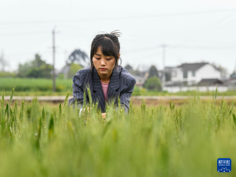 3月26日,在四川省成都市崇州市隆兴镇,王伶俐在田间查看冬小麦的长势情况。新华社记者 王曦 摄