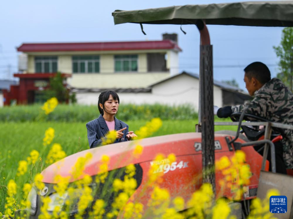 3月26日,在四川省成都市崇州市隆兴镇,王伶俐(左)在和拖拉机手交接土地翻耕区域和注意事项。新华社记者 王曦 摄