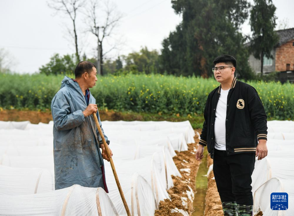 4月2日,在四川省达州市通川区北山镇,雷超(右)在和农户交流水稻育秧情况。新华社记者 王曦 摄
