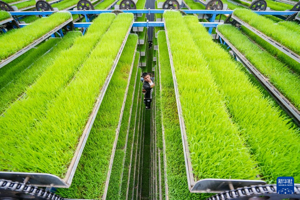 4月3日,在四川省眉山市彭山区天府粮仓数智水稻示范基地,罗凯在循环式育秧机上查看水稻秧苗长势。新华社记者 王曦 摄