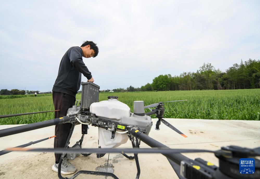 3月26日,在四川省成都市崇州市隆兴镇,王李锐在操作无人机进行冬小麦田间病虫害防治。新华社记者 王曦 摄