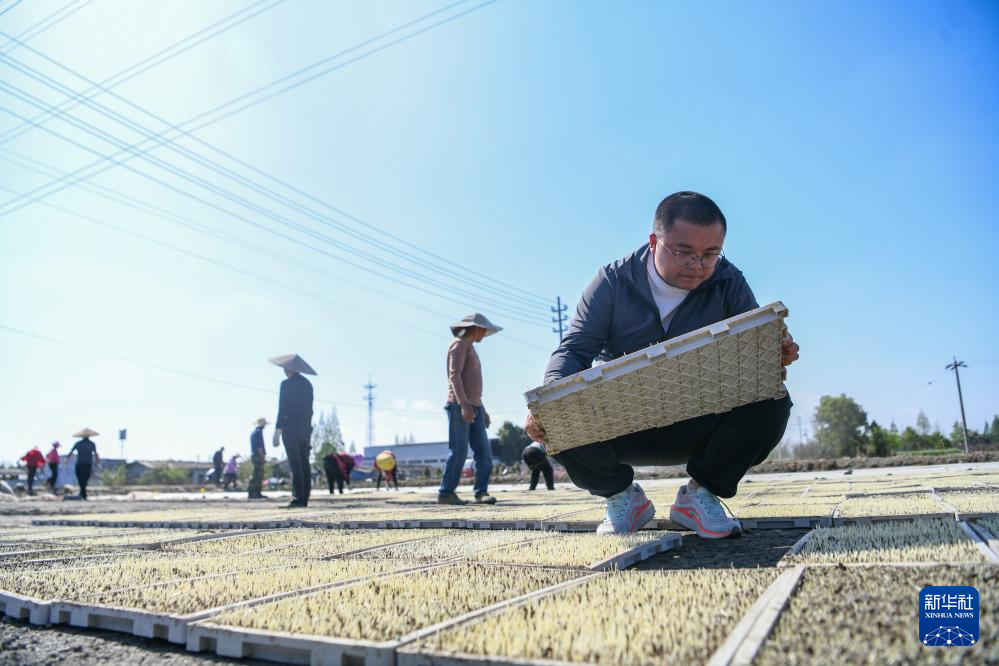 4月3日,在四川省眉山市彭山区天府粮仓数智水稻示范基地,罗凯在循环式育秧机上查看水稻秧苗长势。
