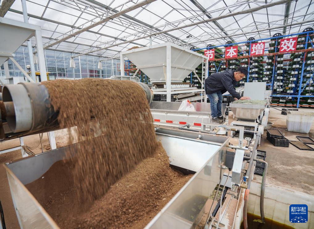 4月3日,在四川省眉山市彭山区天府粮仓数智水稻示范基地,罗凯在自动化播种流水线上添加水稻种子。