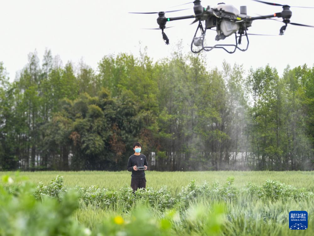3月26日,在四川省成都市崇州市隆兴镇,王李锐在操作无人机进行冬小麦田间病虫害防治。25岁的王李锐是四川省成都市崇州市杨柳土地股份合作社的一名农机手。凭借爱钻研的劲儿,王李锐熟练掌握了驾驶各种现代化农机设备及无人机植保等技能。曾经在外打工的他2022年主动选择回到村里全职从事农业生产,成为了一名“农机潮人”。