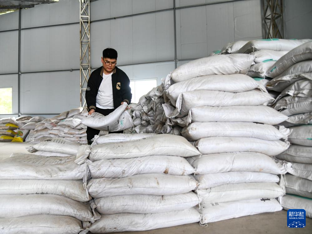 4月2日,在四川省达州市通川区北山镇,雷超在库房搬运化肥。