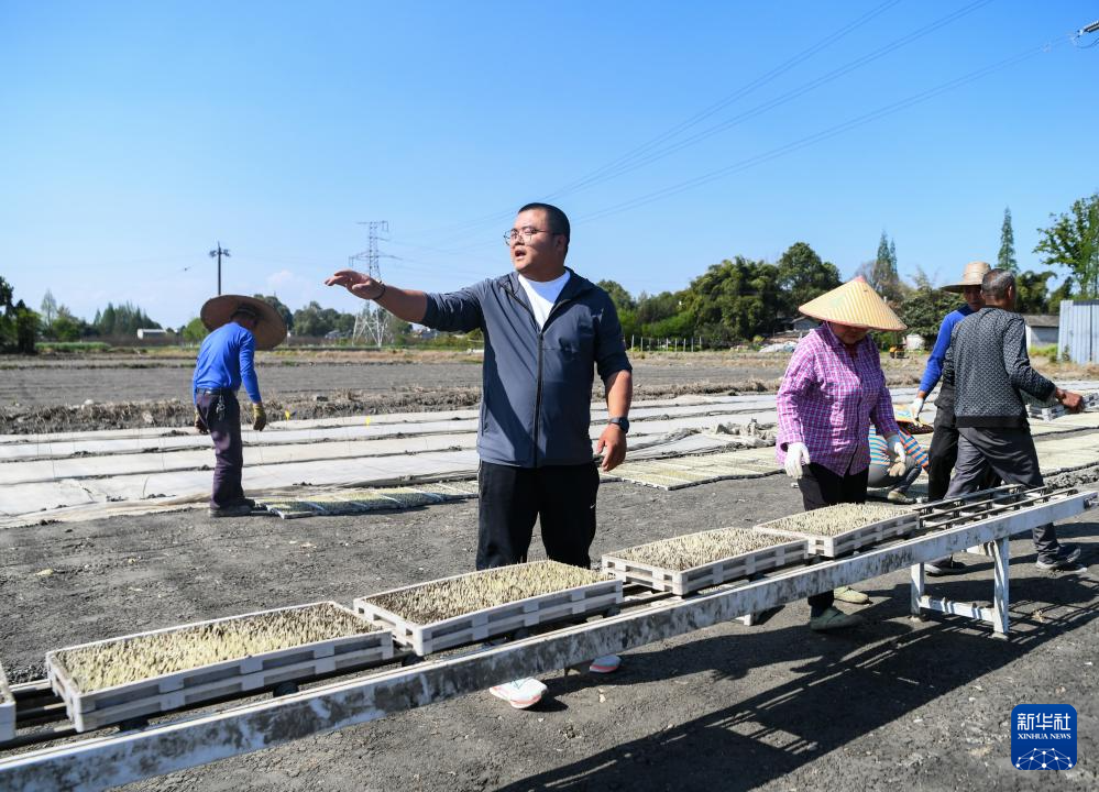3月28日,在四川省成都市崇州市三江街道,舒星宇(左二)在指挥合作社工人搬运育秧盘。