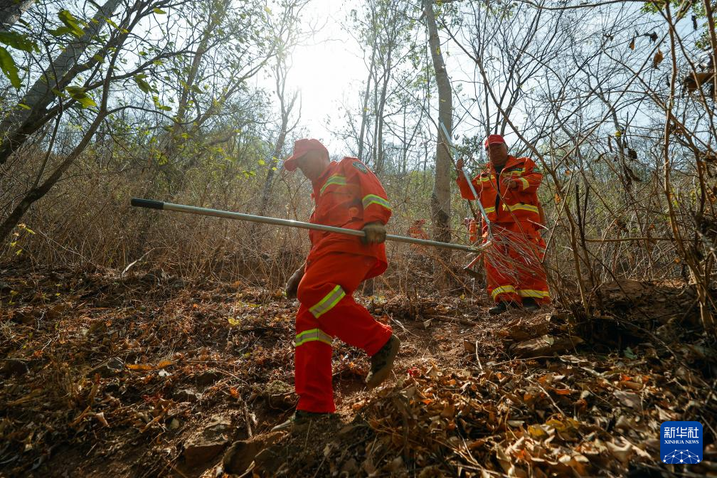 4月10日,四川省攀枝花市普威国有林保护局得石国有林场的管护员在山中巡护时清理可燃物。新华社记者 沈伯韩 摄