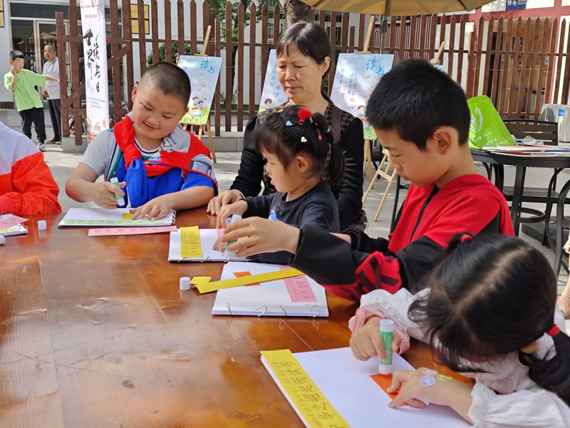 活动中,孩子们争相分享着自己关于书籍的见解,展示着日常学习到的知识。孩子们还通过与家长合作、与其他小伙伴互相帮助的形式,完成诗词短句的拼接,并粘贴在自己制作的书籍上。