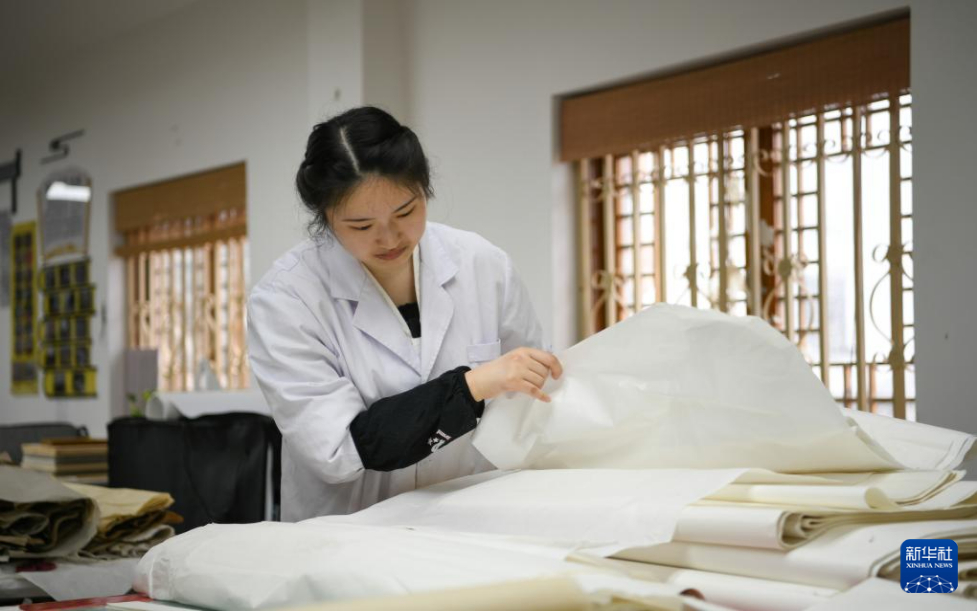 在四川西部文献修复中心,唐陈韵准备修复用的托纸(4月19日摄)。新华社记者 胥冰洁 摄
