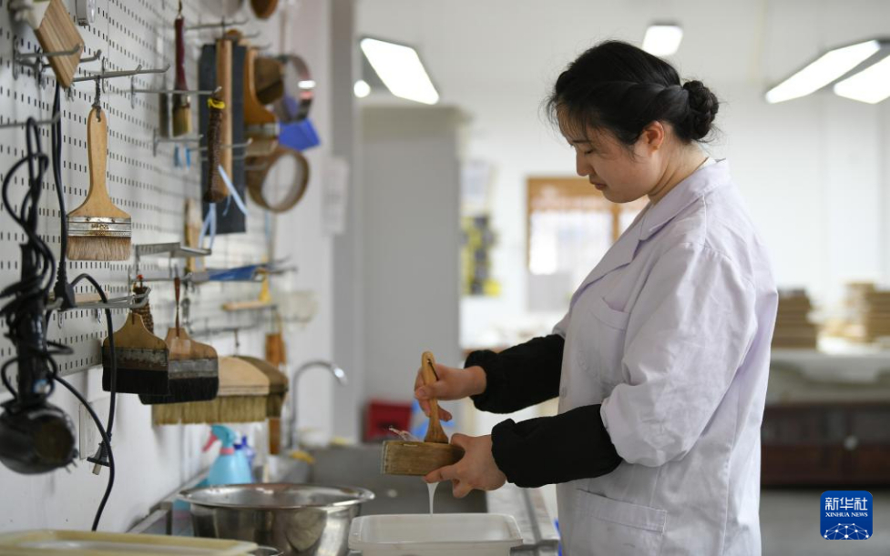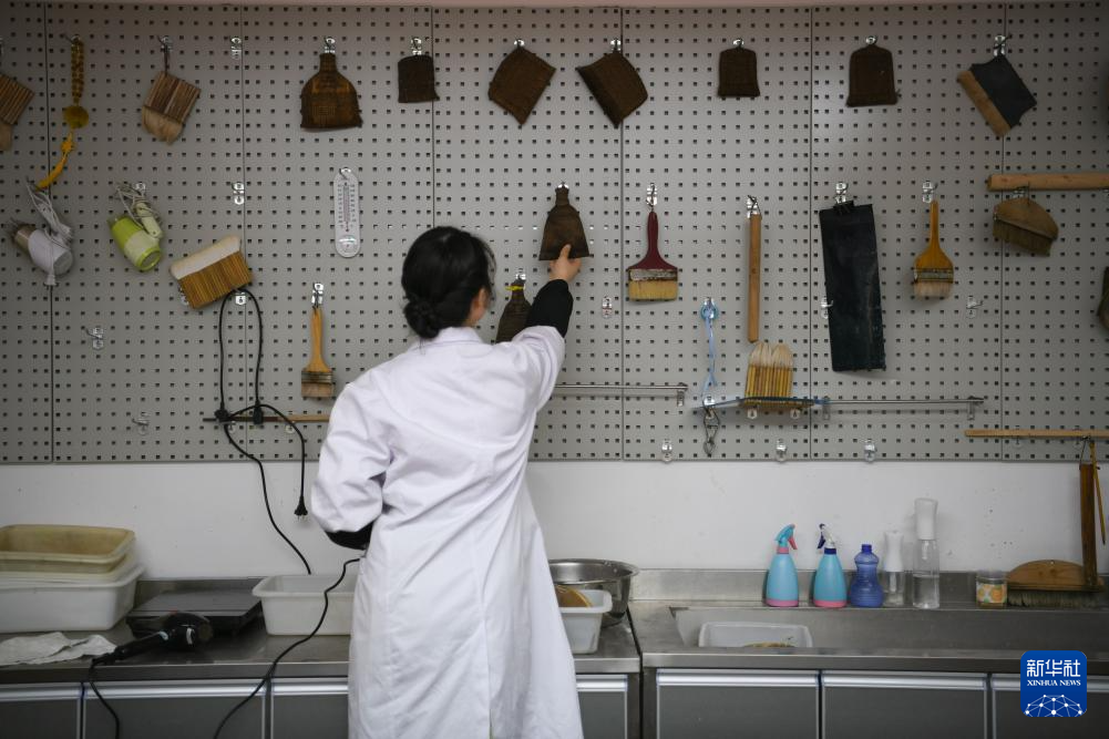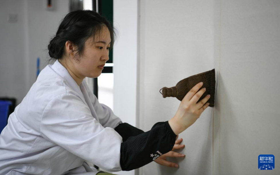 在四川西部文献修复中心,唐陈韵将修复用的托纸上墙晾干(4月19日摄)。新华社记者 胥冰洁 摄