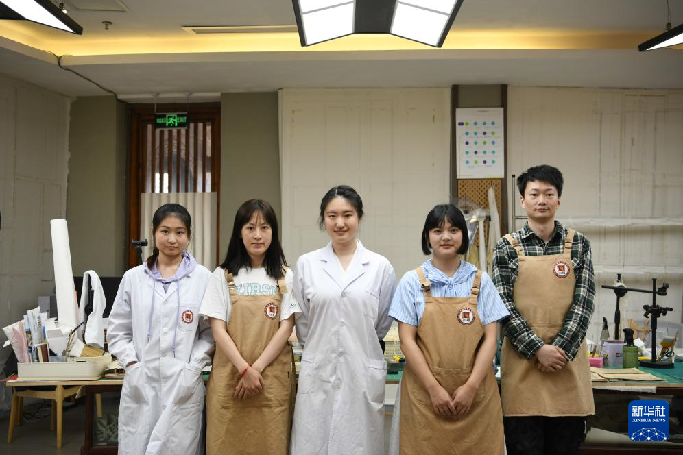 唐陈韵(中)与四川西部文献修复中心的部分青年古籍修复师合影(4月19日摄)。新华社记者 胥冰洁 摄