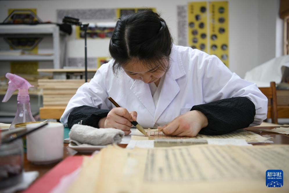 在四川西部文献修复中心,唐陈韵从事修复工作(4月19日摄)。新华社记者 胥冰洁 摄