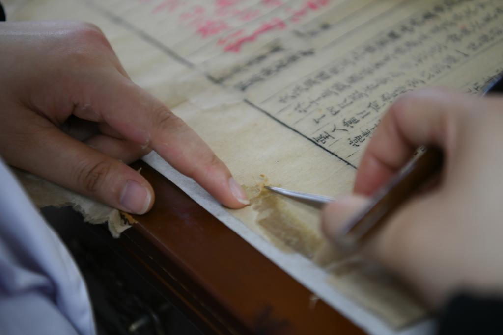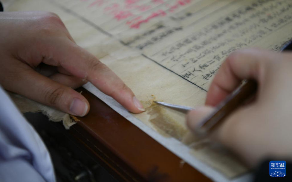 在四川西部文献修复中心,唐陈韵将纸张破损处经修复后多余的部分揭除(4月19日摄)。新华社记者 胥冰洁 摄