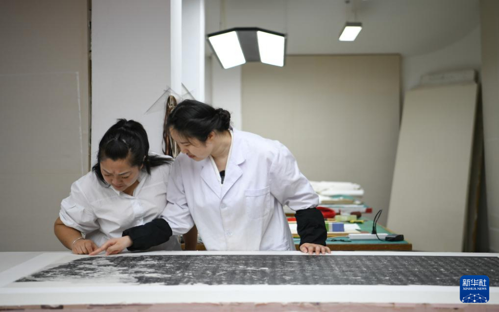 唐陈韵(右)与同事交流近期完成的一件拓片修复情况(4月19日摄)。新华社记者 胥冰洁 摄