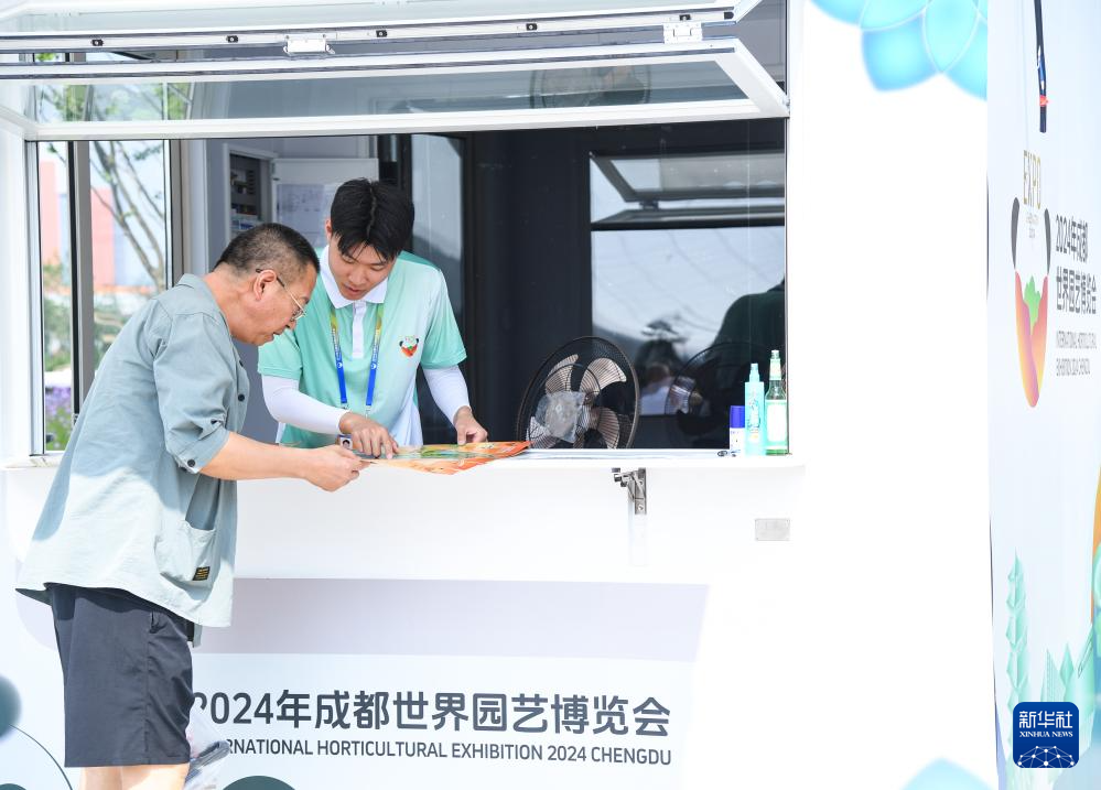 4月27日,在成都世园会主会场志愿者服务小站,志愿者在解答游客问询。新华社记者 王曦 摄