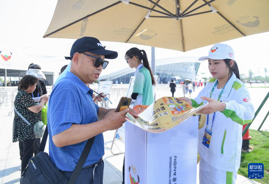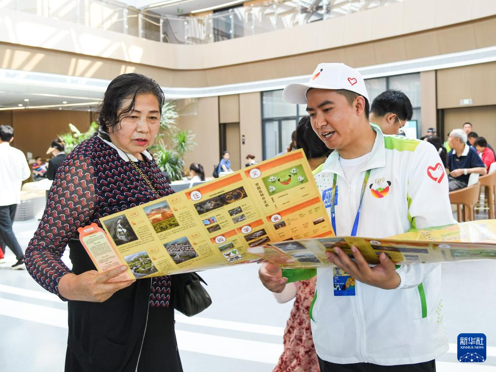 4月27日,在成都世园会主会场综合服务馆,志愿者为游客发放园区导览图。新华社记者 王曦 摄