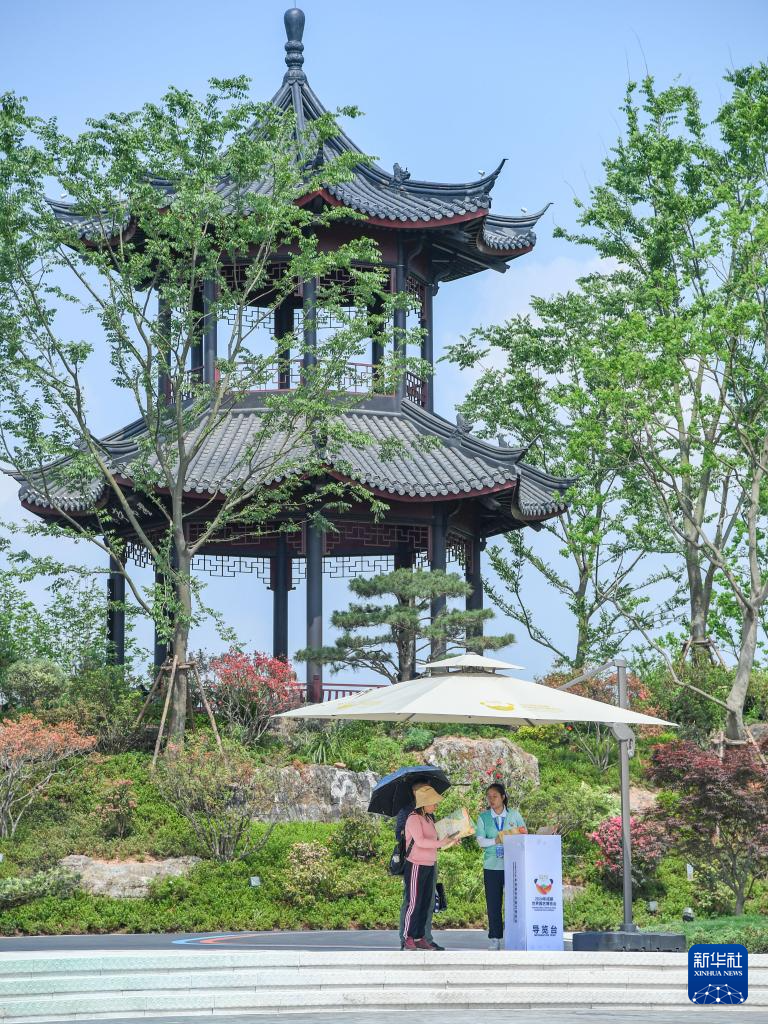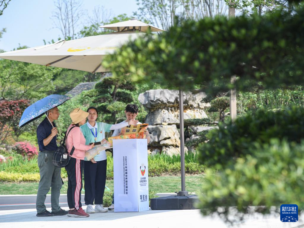 4月27日,在成都世园会主会场成都园,志愿者为游客提供引导服务。新华社记者 王曦 摄