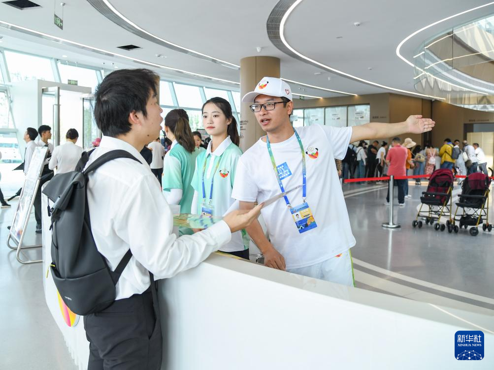 4月27日,在成都世园会主会场综合服务馆,志愿者为游客提供引导服务。新华社记者 王曦 摄