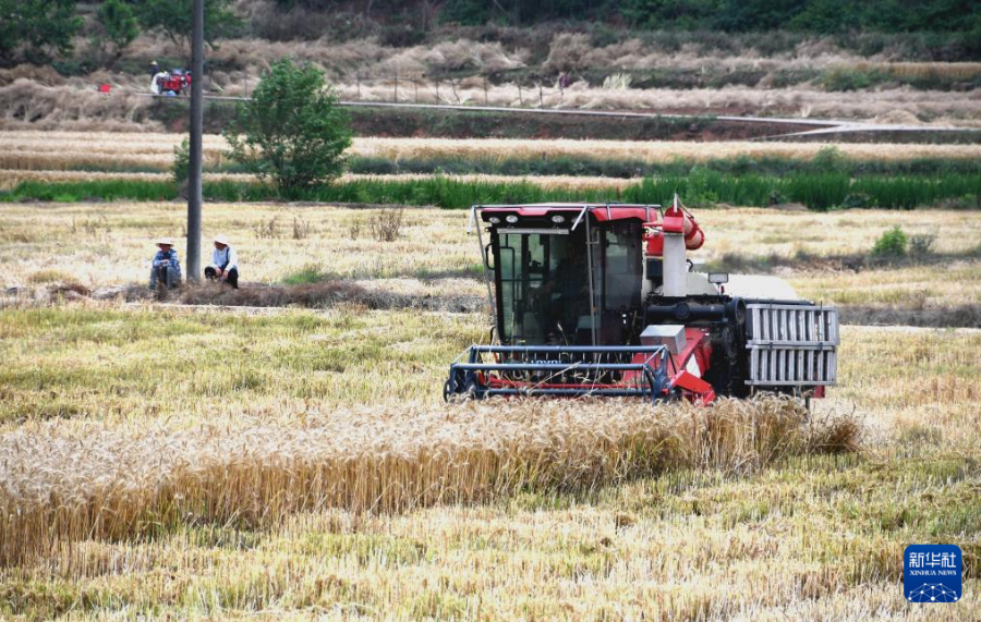 5月11日,在四川省德阳市中江县永太镇石狮村,一台收割机正在收小麦。新华社记者高健钧 摄