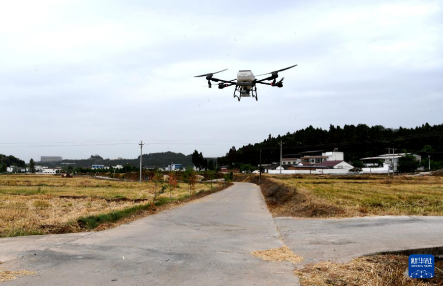5月11日,在四川省德阳市中江县永太镇石狮村,一台无人机正在作业。新华社记者高健钧 摄