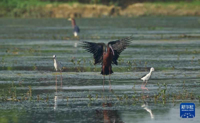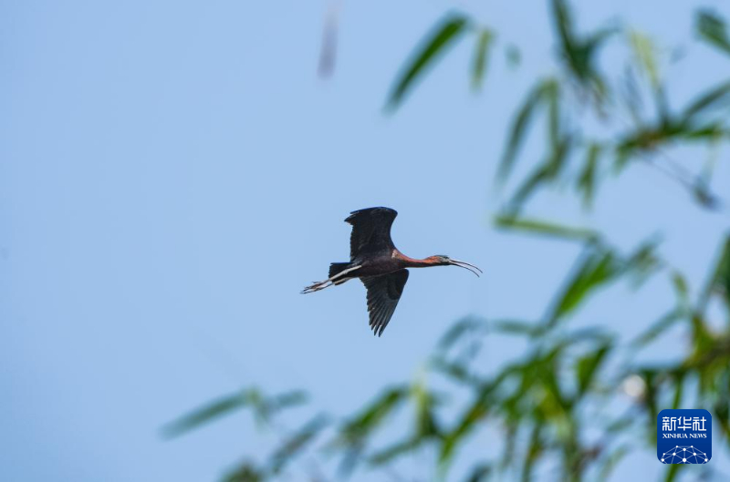 在成都邛崃市固驿街道,彩鹮在空中飞行(5月20日摄)。新华社发(向文军摄)