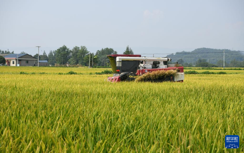 近日,位于四川眉山市洪雅县的“天府粮仓”止戈安宁万亩核心示范区,水稻迎来丰收,村民抢抓农时进行收割。