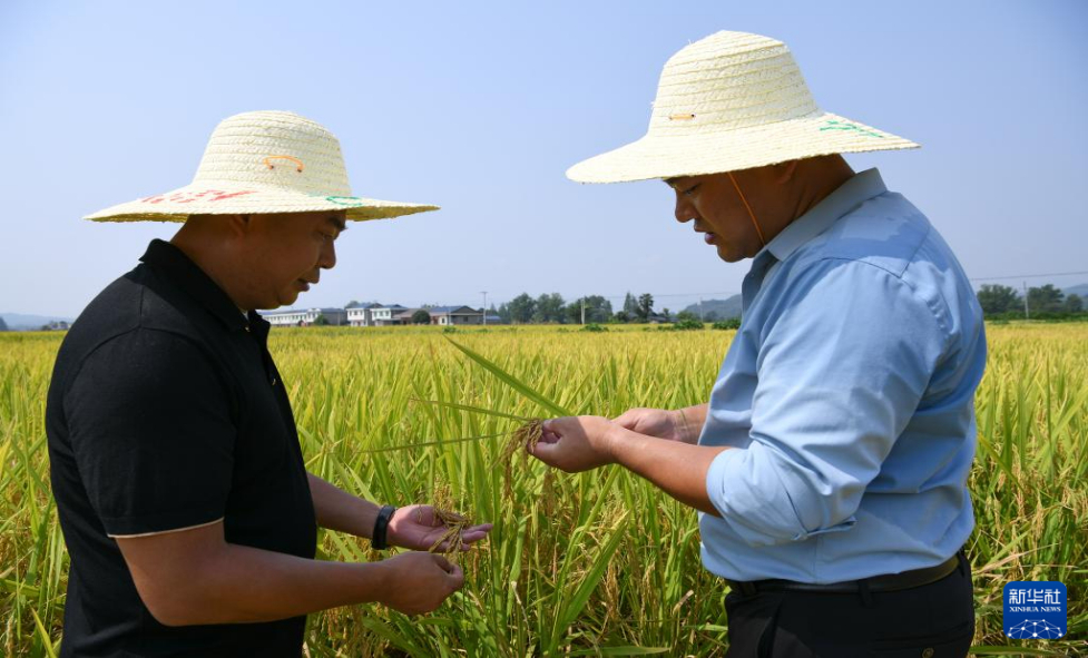 8月26日,在洪雅县“天府粮仓”止戈安宁万亩核心示范区,四川农业科学院作物研究所水稻专家朱从桦(右)与当地种植大户观察示范区内水稻情况。新华社记者 胥冰洁 摄