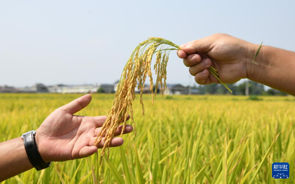 8月26日,在洪雅县“天府粮仓”止戈安宁万亩核心示范区,四川农业科学院作物研究所水稻专家展示示范区内种植的水稻。新华社记者 胥冰洁 摄