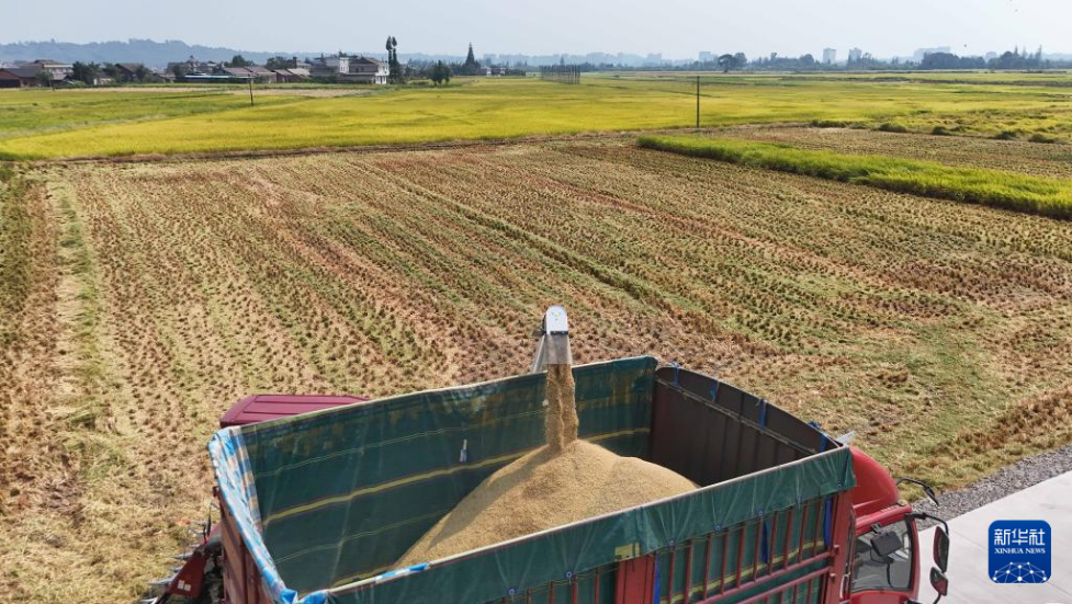 8月26日,在洪雅县“天府粮仓”止戈安宁万亩核心示范区,村民将收割的水稻装入货车(无人机照片)。新华社记者 胥冰洁 摄