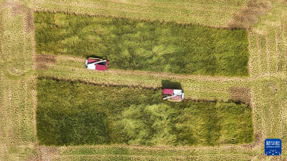 8月26日,在洪雅县“天府粮仓”止戈安宁万亩核心示范区,村民驾驶收割机收割水稻(无人机照片)。新华社记者 胥冰洁 摄