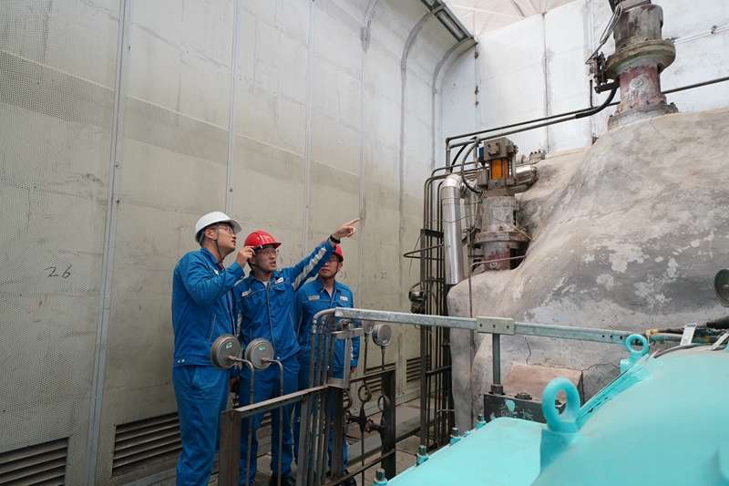 四川石化公司自备电站,岗位人员在高温下检查发电机组运行情况。(杨尚陶 摄)
