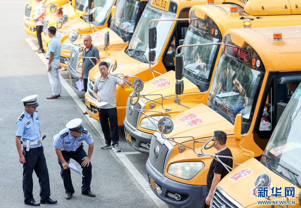 8月28日,四川省华蓥市公安局交通警察大队的民警在对校车尾灯进行检查。