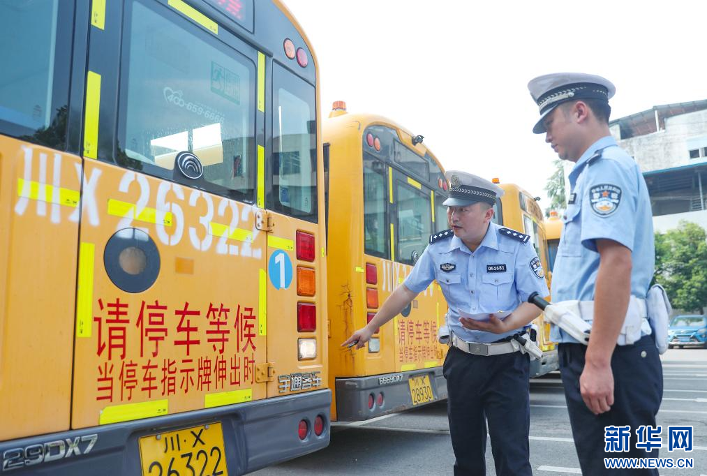 8月28日,四川省华蓥市公安局交通警察大队的民警对校车安全性能和随车配备的安全应急器材设备等进行检查。